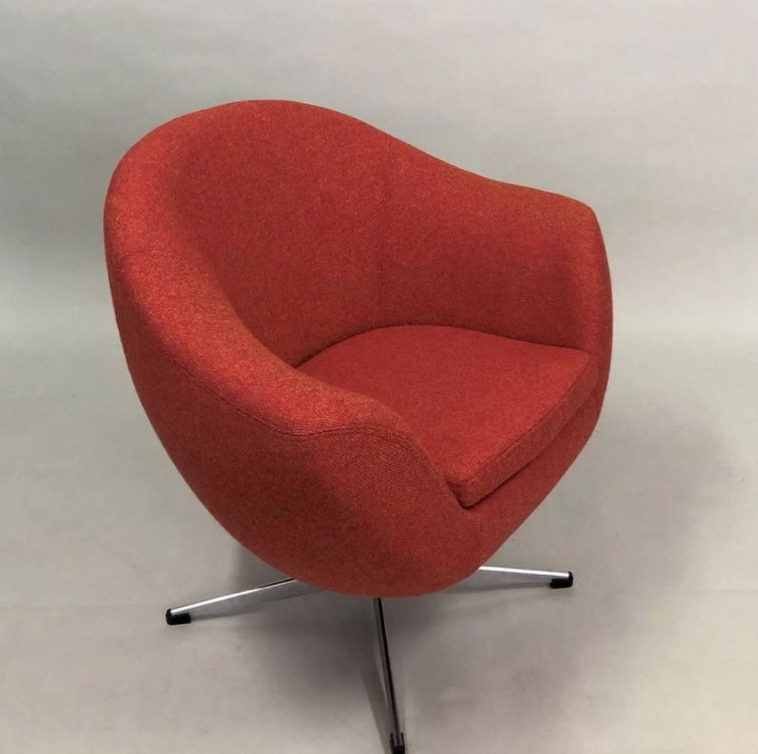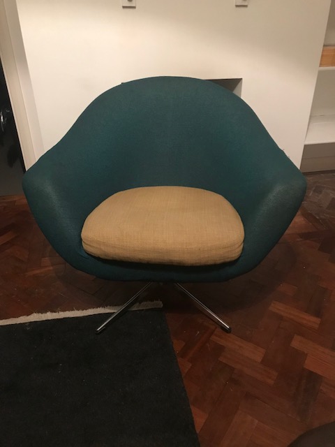 A mid-century modern concave chair, reupholstered and recovered using modern techniques. Over the years the original fabric had been recovered with a flexible, elastic loose cover. A well loved chair, the base foam had degraded and needed to be rebuilt and supported. The top fabric was then tailored on to the chair. Fabric: Bute Tweed, Masala (Click here to visit their website.)