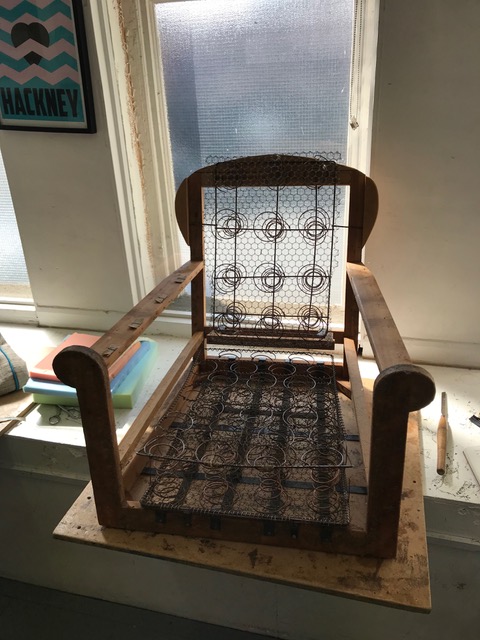 Two Victorian era Iron Back chairs (French). Possibly not so surprising chairs often arrive in pairs. These two gorgeous iron back chairs arrived with broken bottoms. We were able to save the original springs and re-lashed their seats. Often we are asked to save as much of the original upholstery as possible, and here we could save the backs and the original buttoning. The calico cloth layer had stretched and warped over time so this was hand stitched to help firm up the structure. The seat was traditionally reupholstered with coir (coconut fibre) and then recovered in the top fabric. It should last another 200 years! Fabric: Linwood Omega Velvet (Click here to visit their website.)