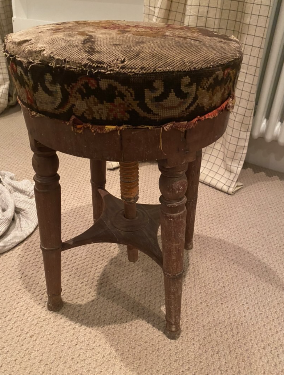 A Victorian music stool, traditionally built. The stool had been used in the garden at some point in its life. Woodwork had been painted various colours and paint had seeped into the wood grain. The client, passionate about respecting the stool’s history, wanted to restore the woodwork and preserve the embroidery as much as possible. We created a calico cover for the original fabric and recovered that with some fabric the client had carefully saved from another personal piece of furniture. Fabric: Sanderson, Vintage Prints, Chelsea (Click here to visit their website.)